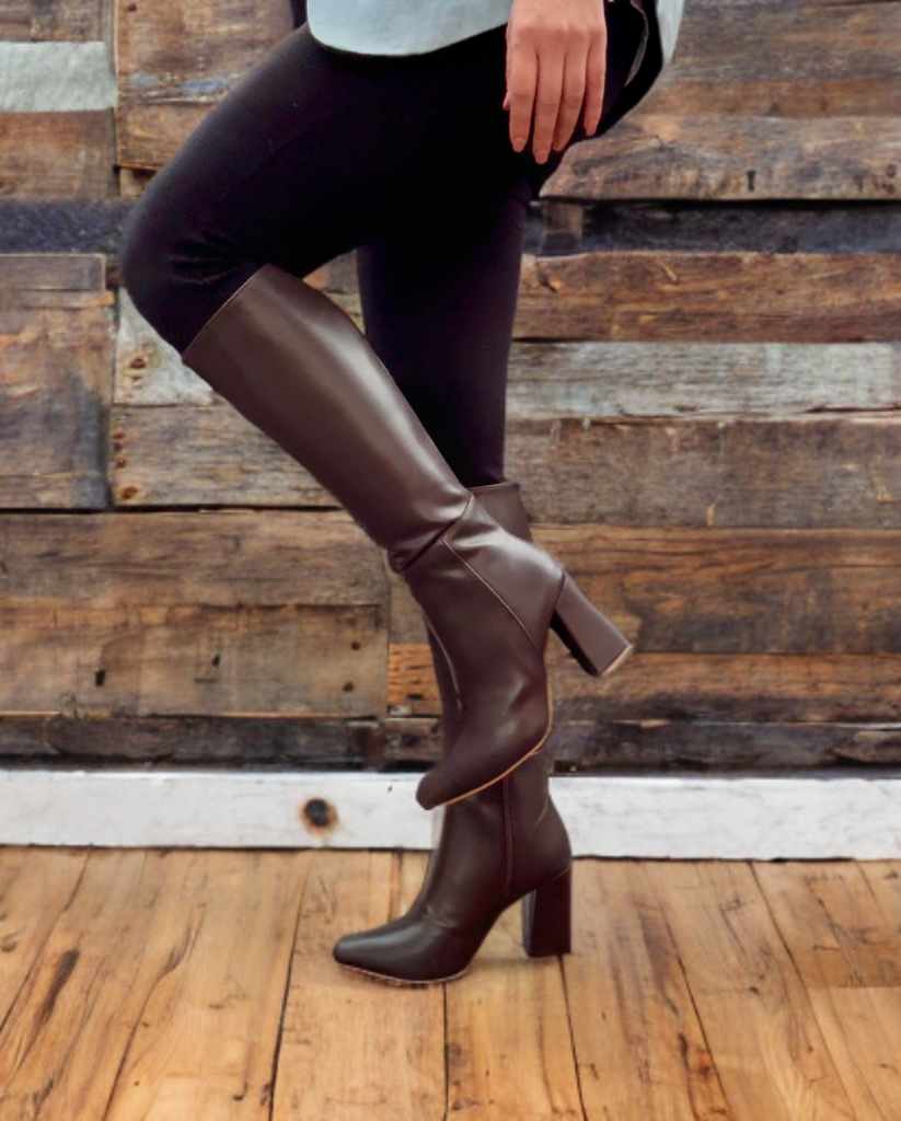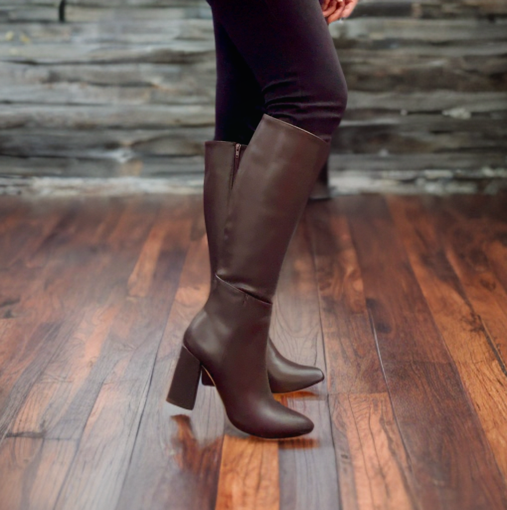 Bota larga, tacón de 9 cm, punta con cierre al costado.