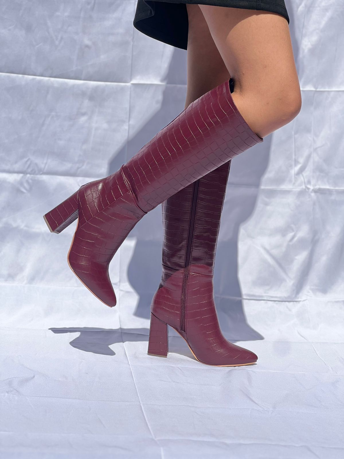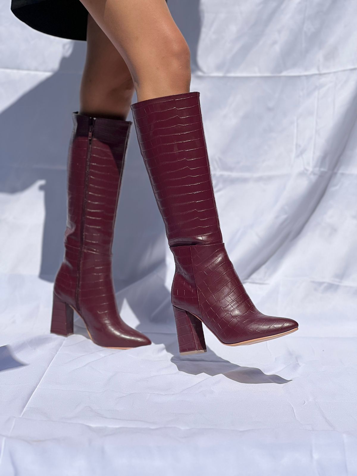 Bota larga, tacón de 9 cm, punta con cierre al costado.