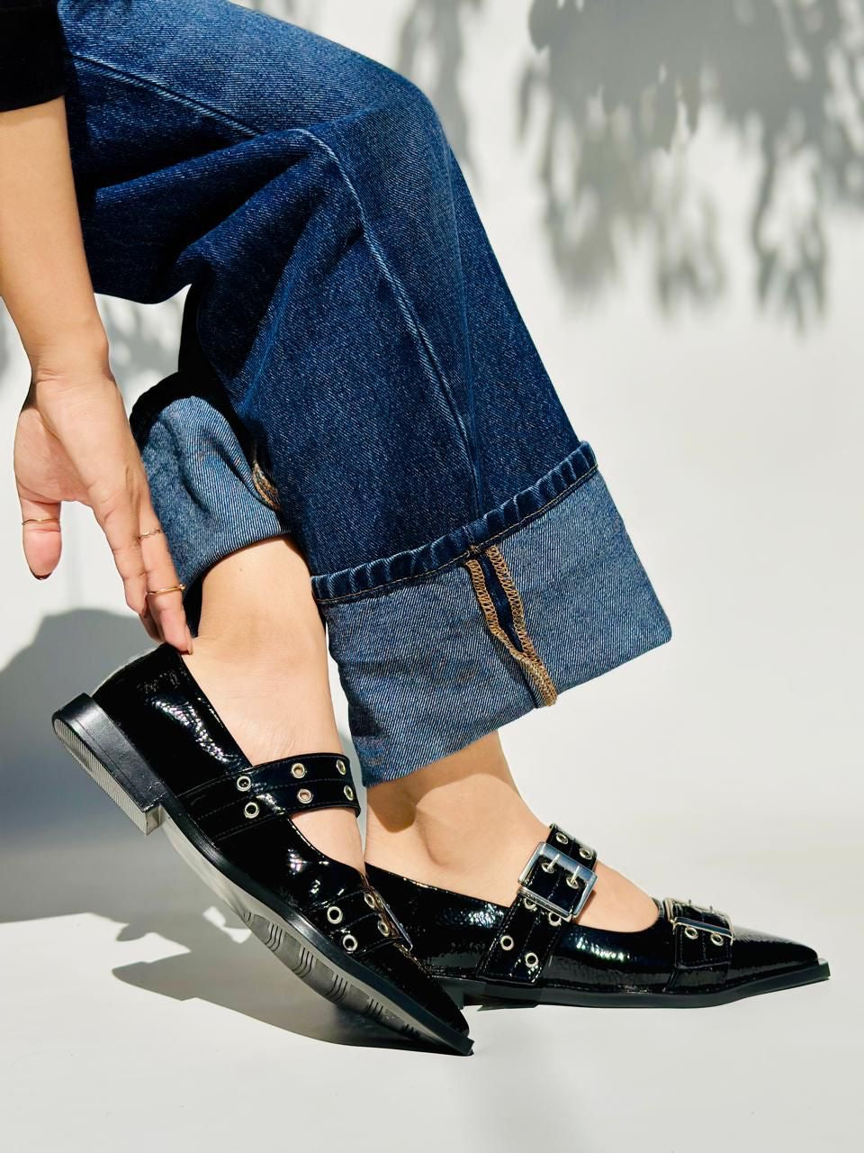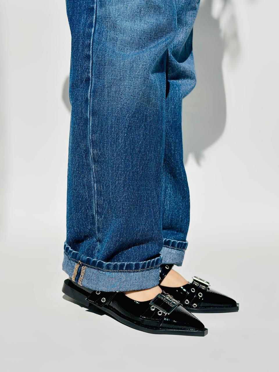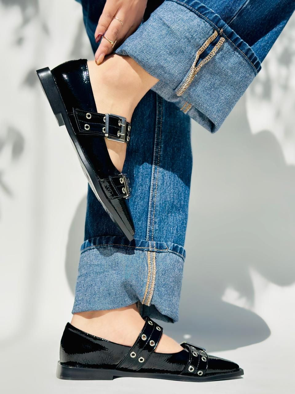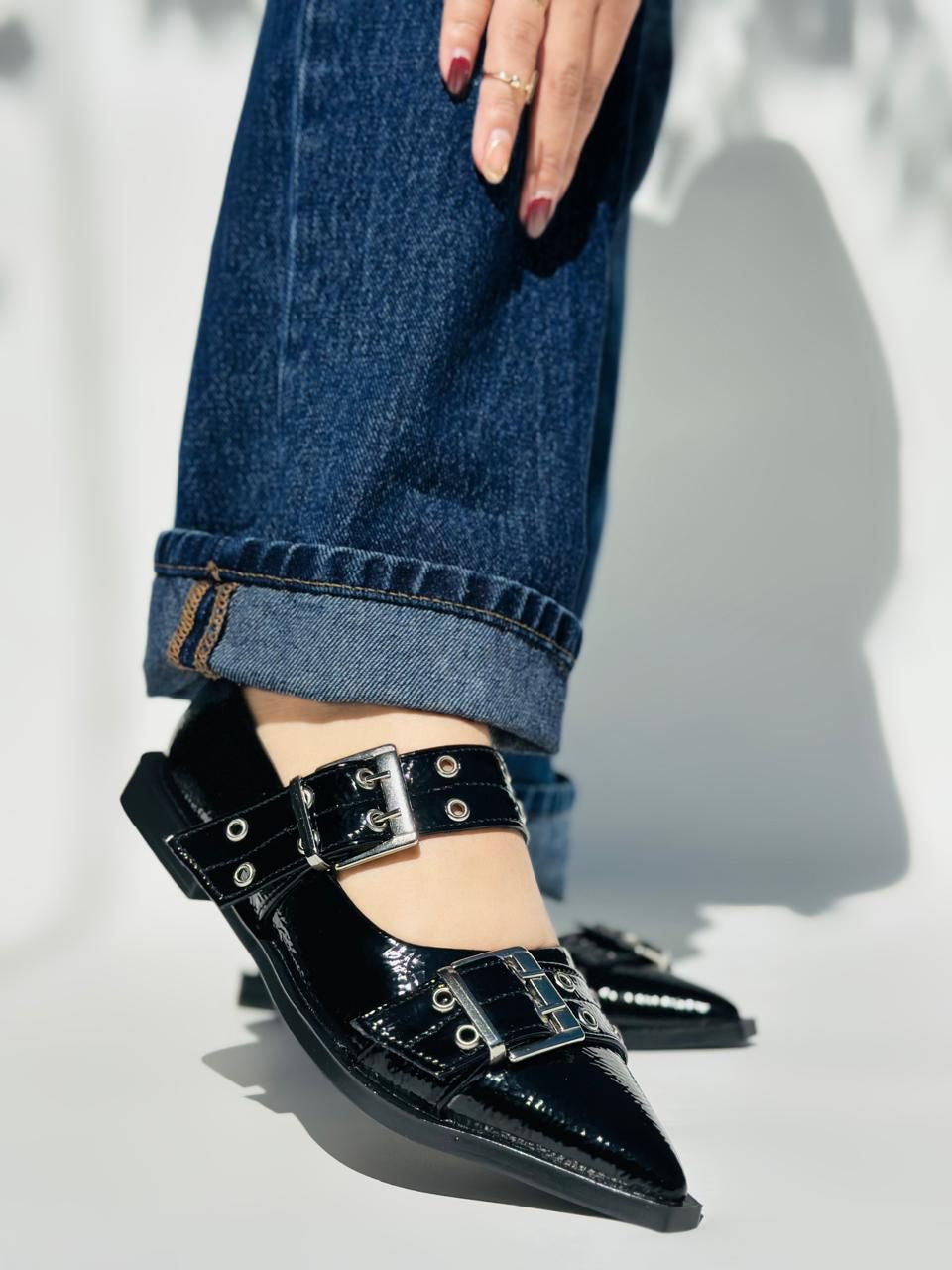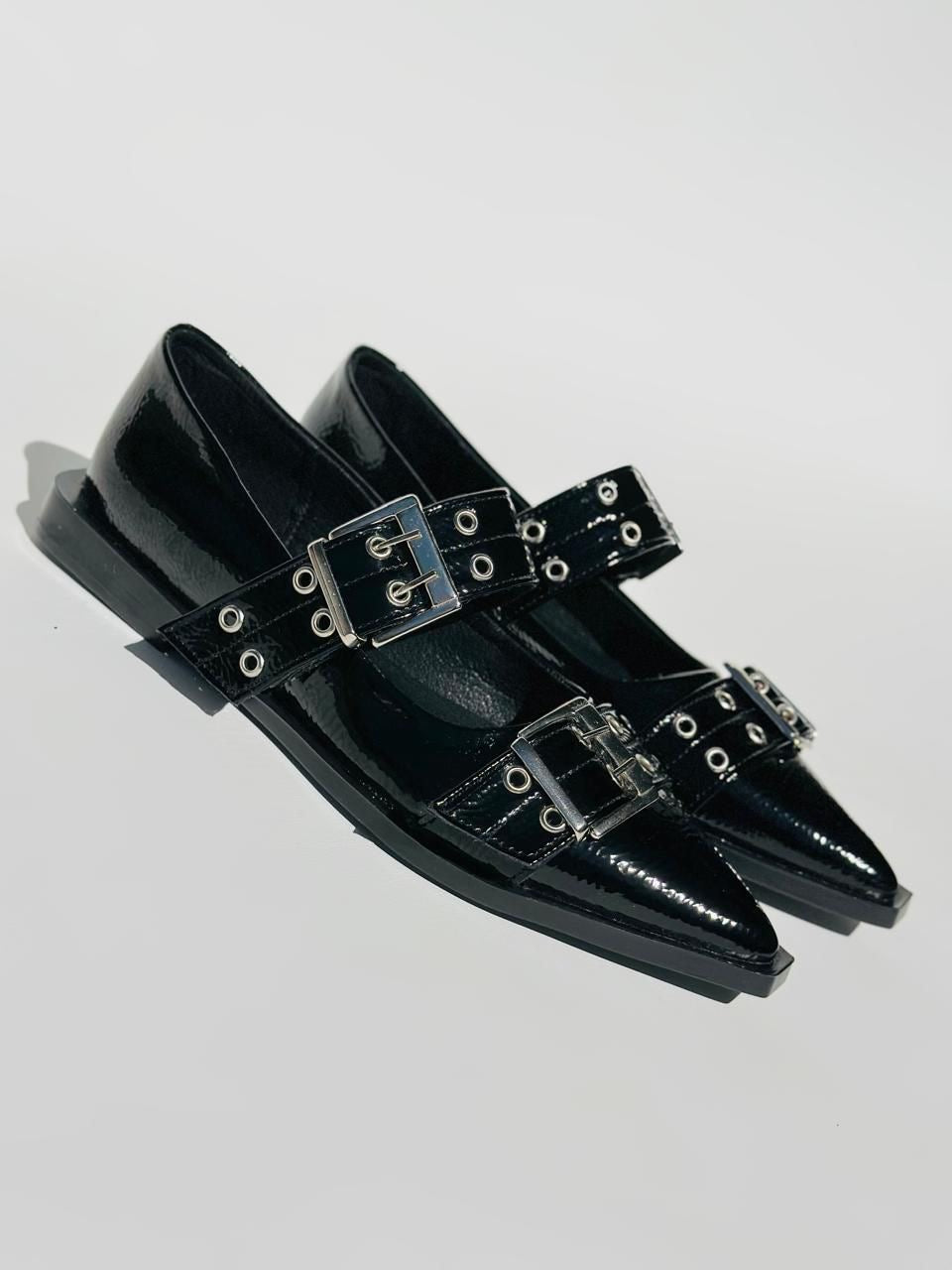 Elegancia y actitud en un solo par. Estos flats en charol negro con hebillas metálicas y ojales le dan un toque rebelde a cualquier outfit. Perfectos para quienes aman un estilo rocker-chic, sin perder la comodidad.