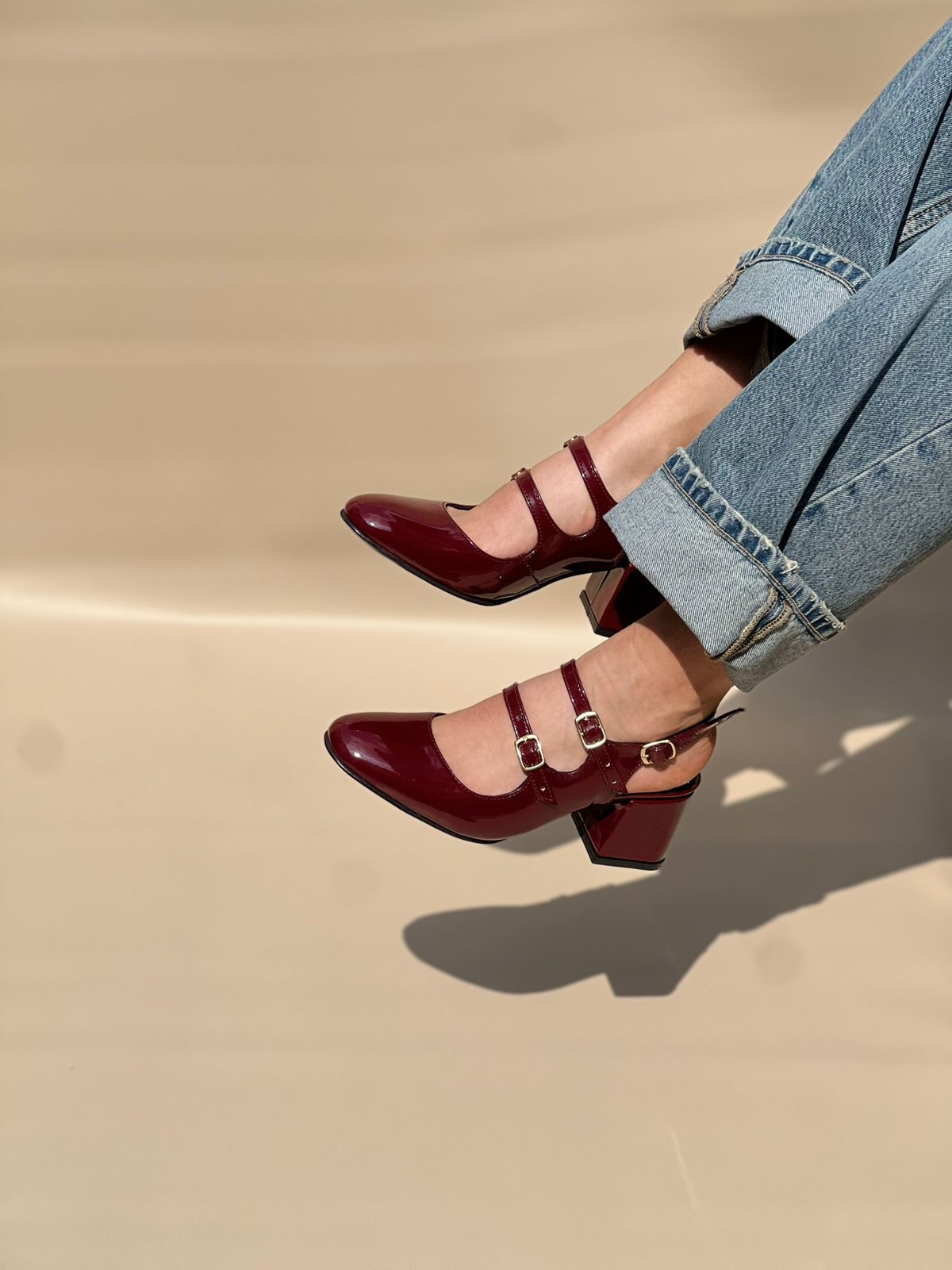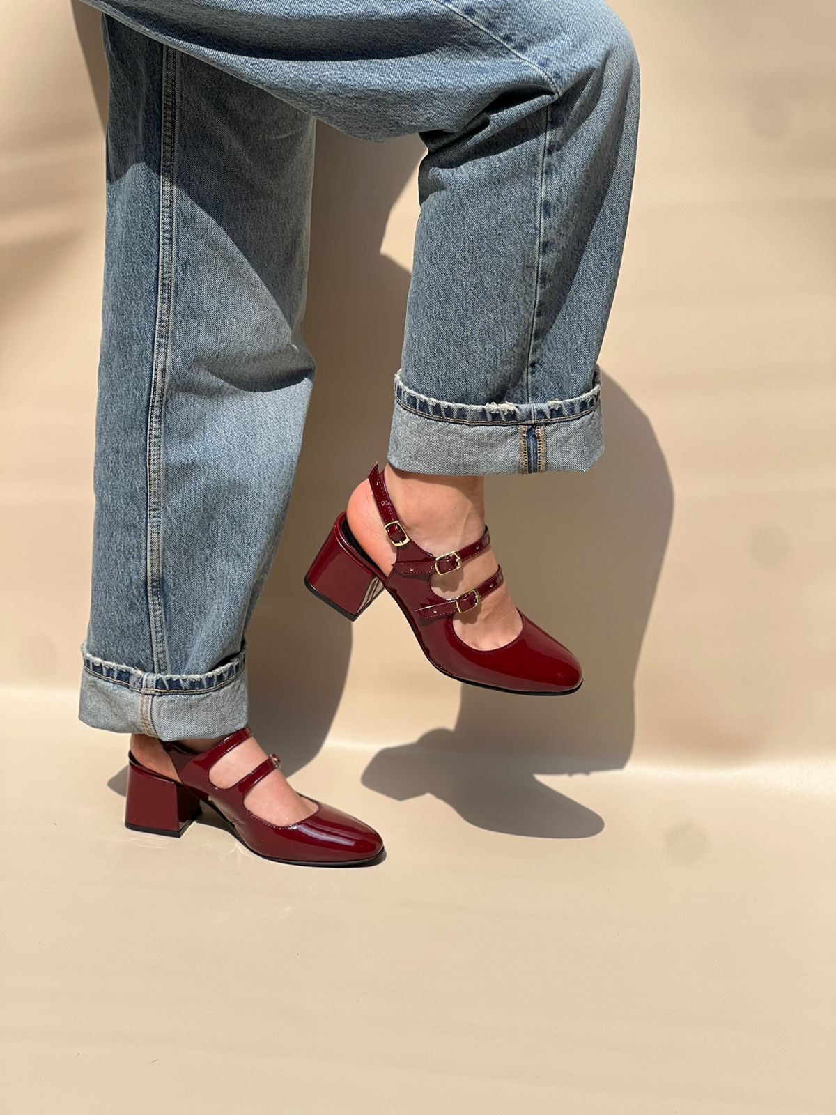Este modelo de zapatos de charol combina un diseño clásico con un toque moderno y versátil. Su punta redonda y las tres correas con hebillas ajustables aportan un estilo retro elegante, mientras que el tacón ancho de 5,5 cm brinda estabilidad y comodidad para el uso diario.