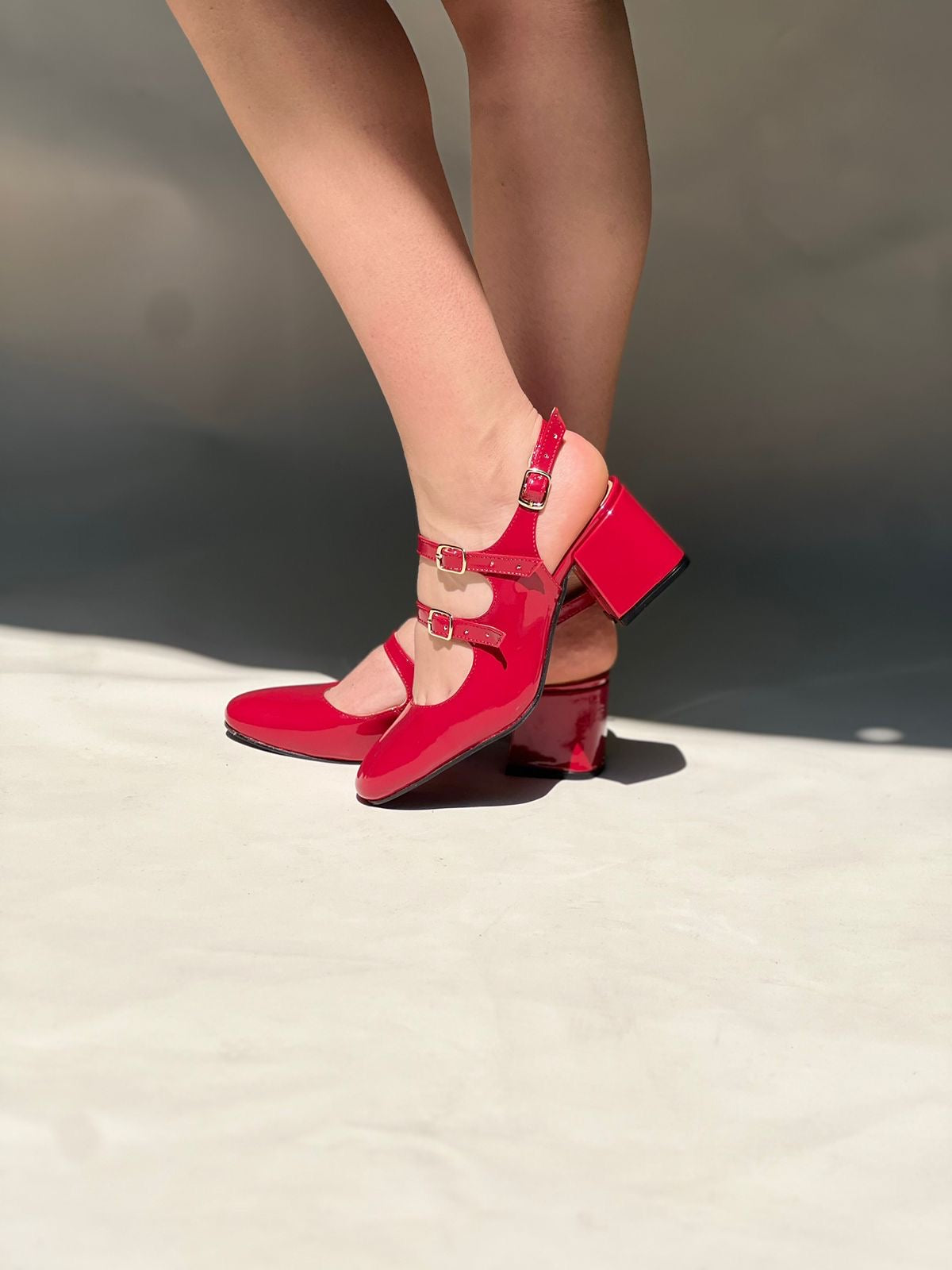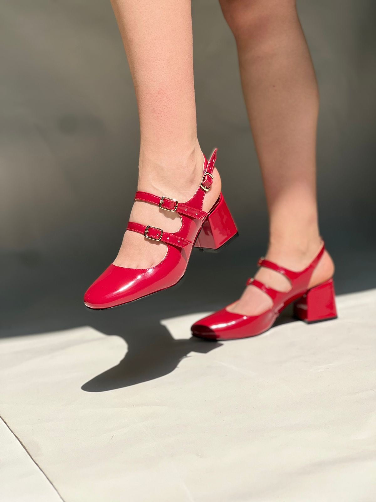 Este modelo de zapatos de charol combina un diseño clásico con un toque moderno y versátil. Su punta redonda y las tres correas con hebillas ajustables aportan un estilo retro elegante, mientras que el tacón ancho de 5,5 cm brinda estabilidad y comodidad para el uso diario.